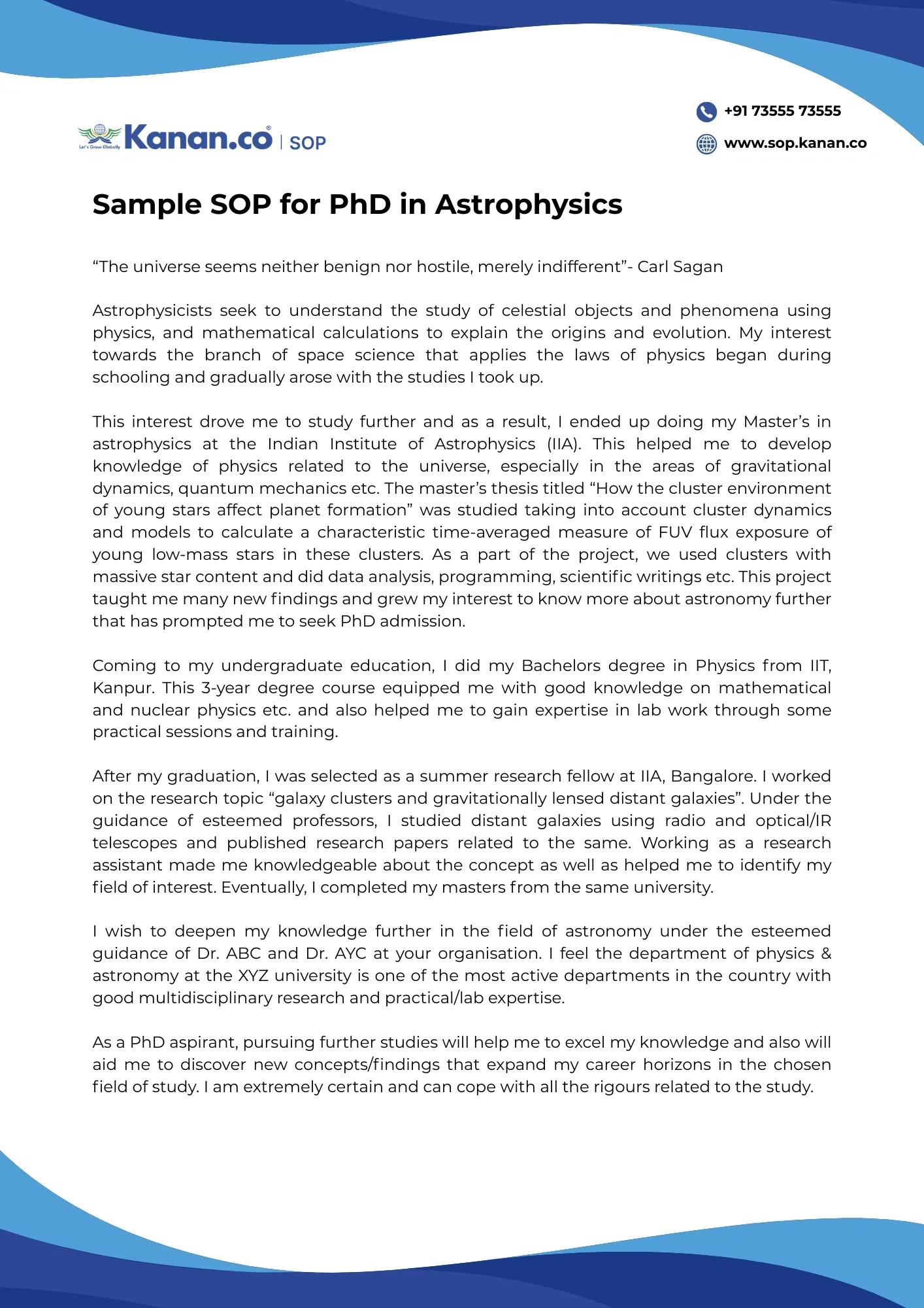 I wish to deepen my knowledge further in the field of astronomy under the esteemed guidance of Dr. ABC and Dr. AYC at your organisation. I feel the department of physics & astronomy at the XYZ university is one of the most active departments in the country with good multidisciplinary research and practical/lab expertise.