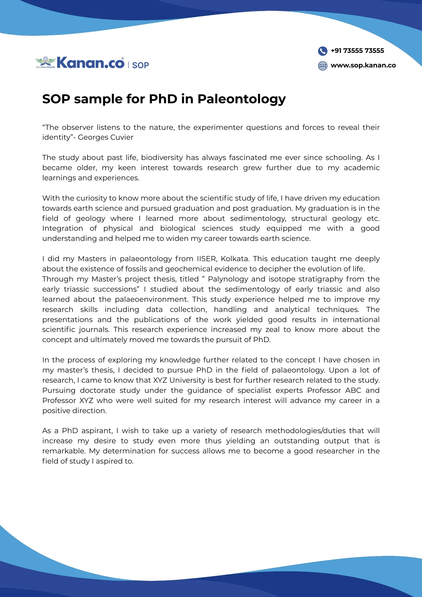 In the process of exploring my knowledge further related to the concept I have chosen in my master’s thesis, I decided to pursue PhD in the field of palaeontology. Upon a lot of research, I came to know that XYZ University is best for further research related to the study. Pursuing doctorate study under the guidance of specialist experts Professor ABC and Professor XYZ who were well suited for my research interest will advance my career in a positive direction.