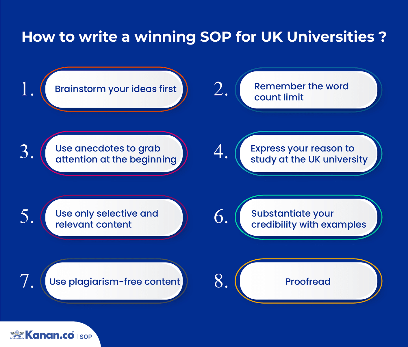 - Substantiate your credibility with examples: Your SOP should include examples that substantiate your credibility. These examples could be from your academic record, research experience, or extracurricular activities. By providing concrete evidence of your abilities, you will make a strong case for why you should be admitted to the UK university of your choice.